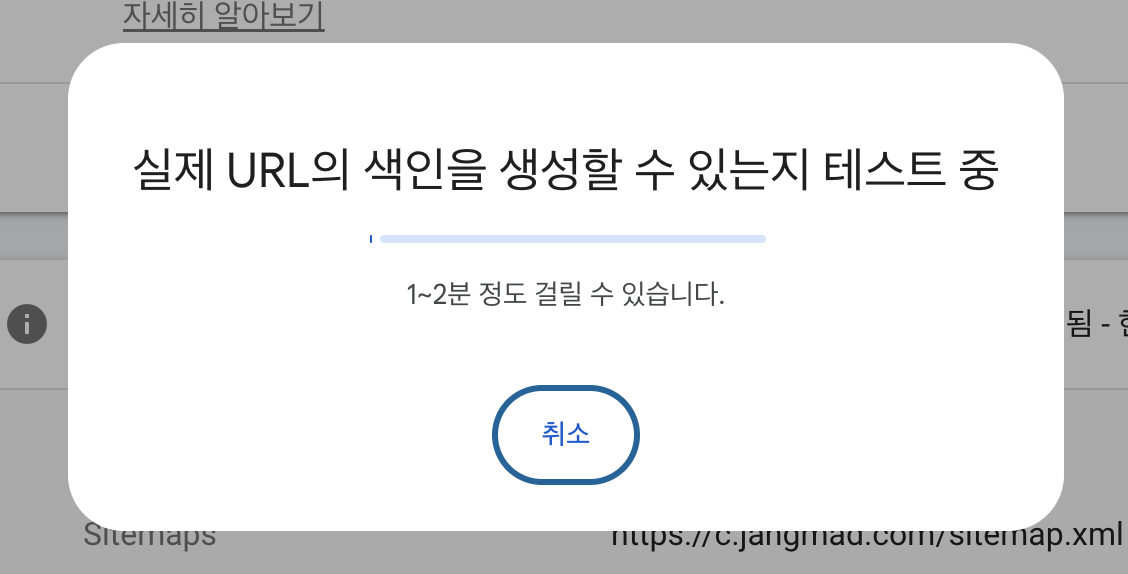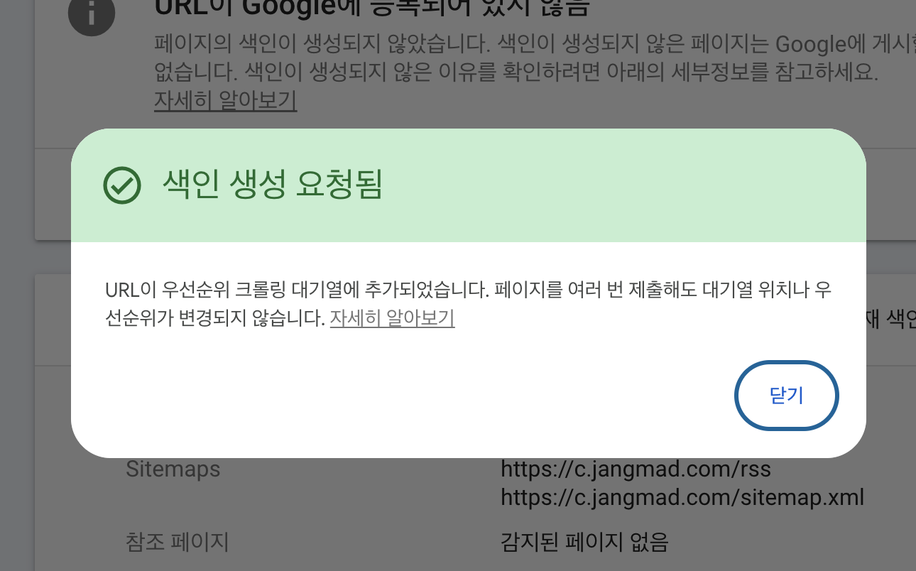 색인 생성 요청을 누르면 아래와 같은 화면이 나오고 1~2분 정도 지나면 색인 생성 완료!!