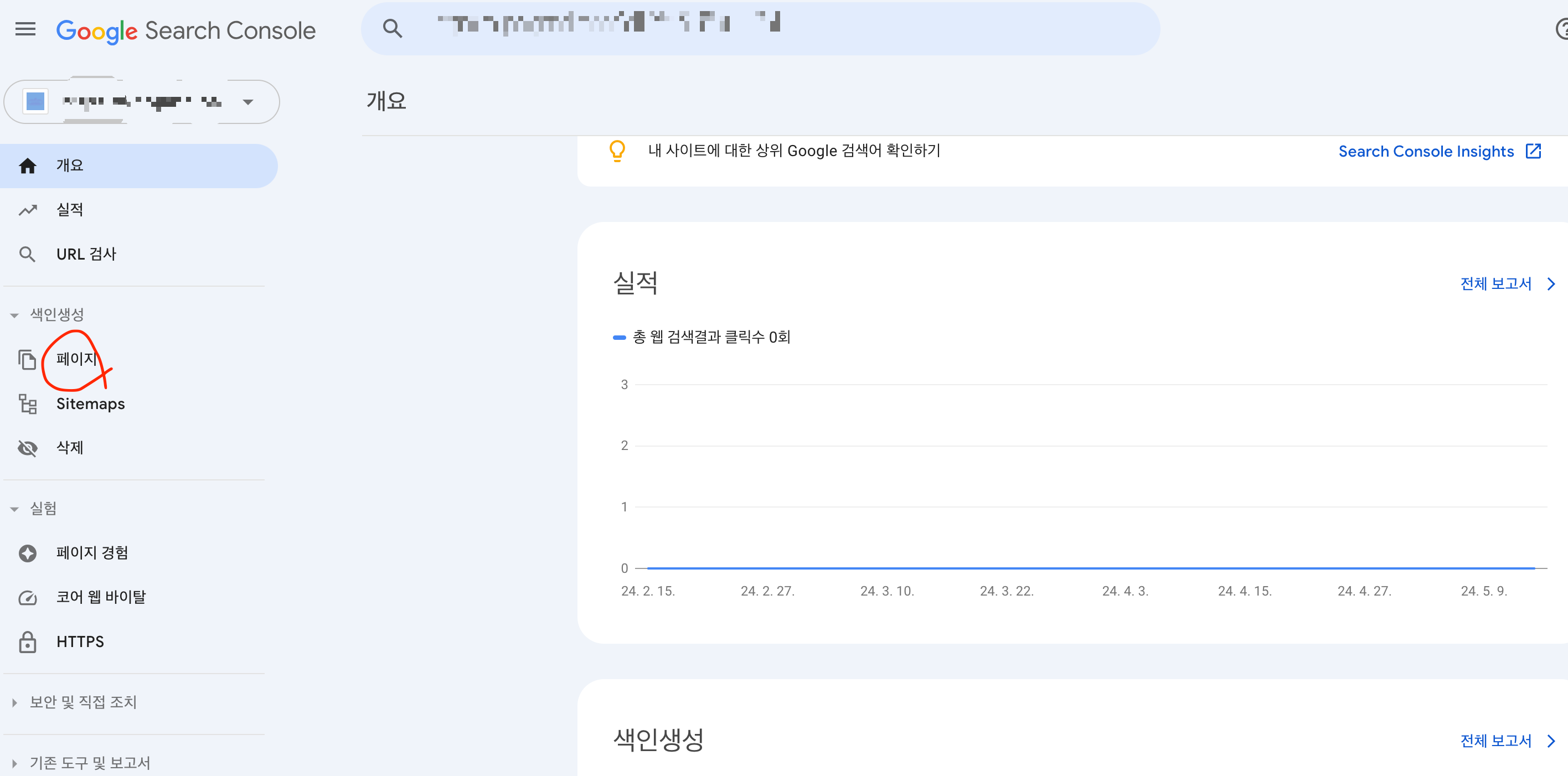1. 구글 서치콘솔에 접속 -> 왼쪽 메뉴에서 페이지 클릭